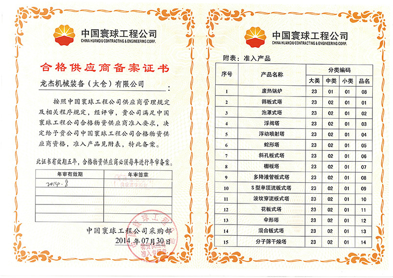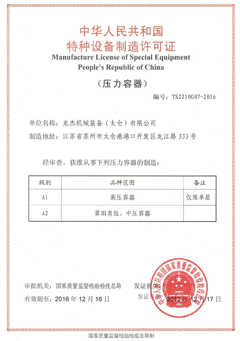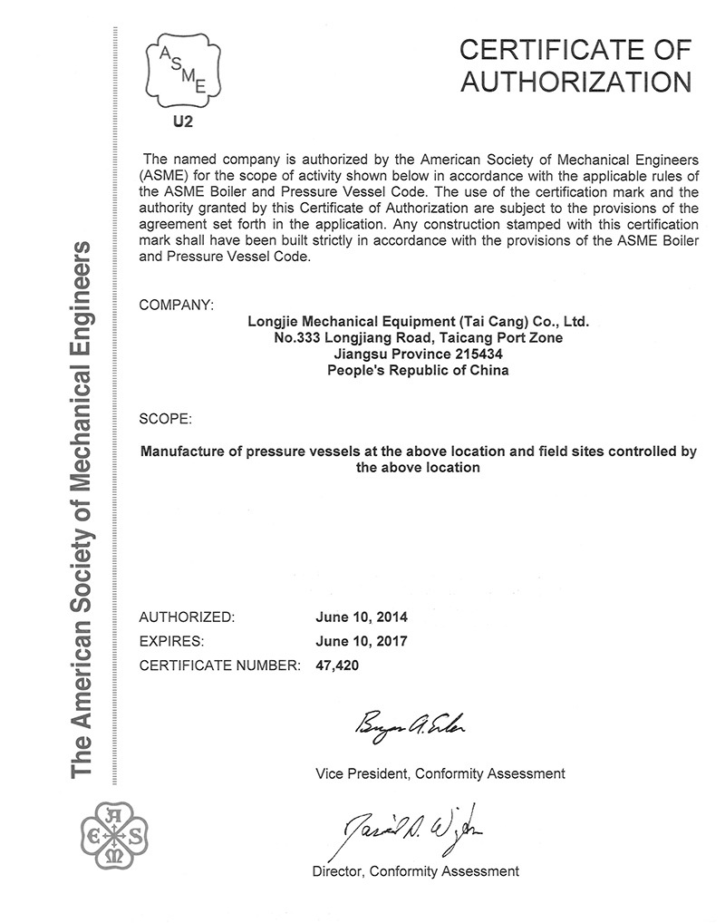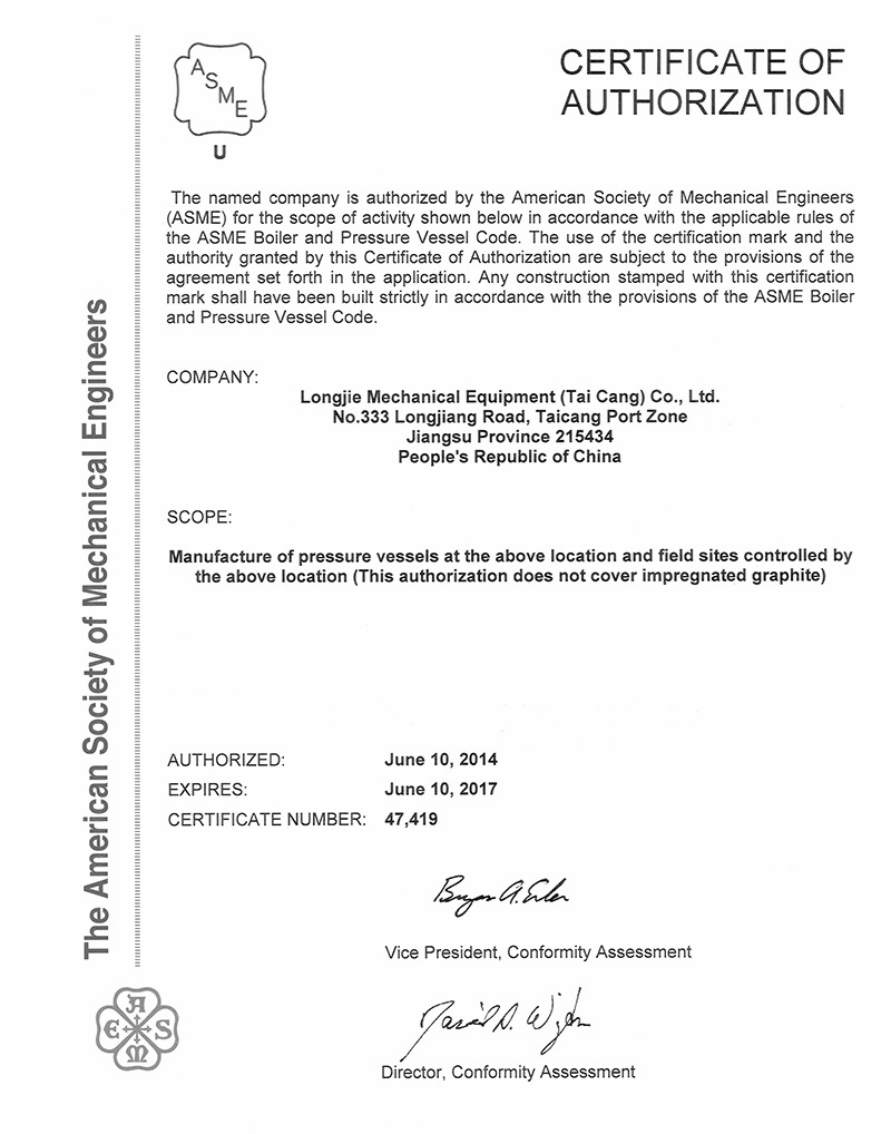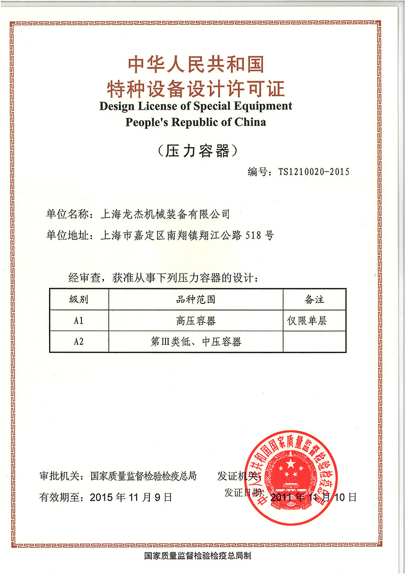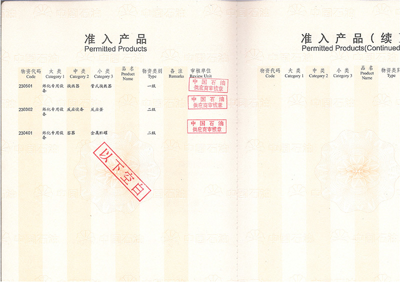 公司具有中國(guó)高、中低壓壓力容器生產(chǎn)許可證(A1級(jí), 包含設(shè)計(jì)、制造),ASME U、U2鋼印證書(shū),PED G模式生產(chǎn)資格,是中石化、中石油、中海油、中化集團(tuán)、國(guó)家能源集團(tuán)等大型知名企業(yè)的合格供應(yīng)商。